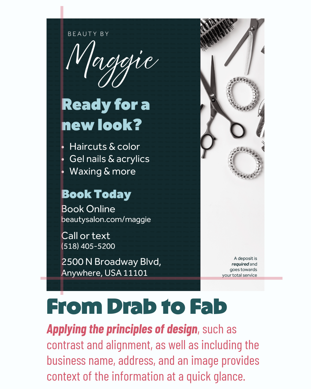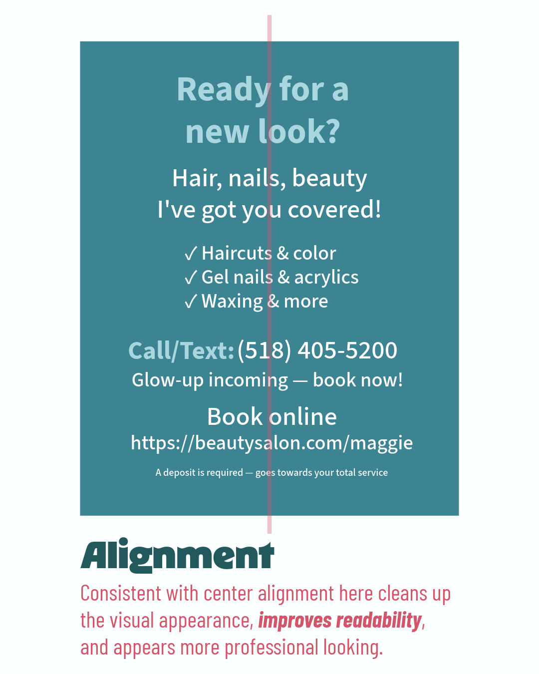 I saw a post on Facebook, of a salon advertising their services. The ad was hard to read and not visually intriguing, so I decided to exemplify what I would personally do to make the advertisement better. I posted this to my Instagram and TikTok, showcasing how a simple application of the principles of design drastically improve the ad. I focused on showcasing how alignment and contrast make a difference and why it matters.